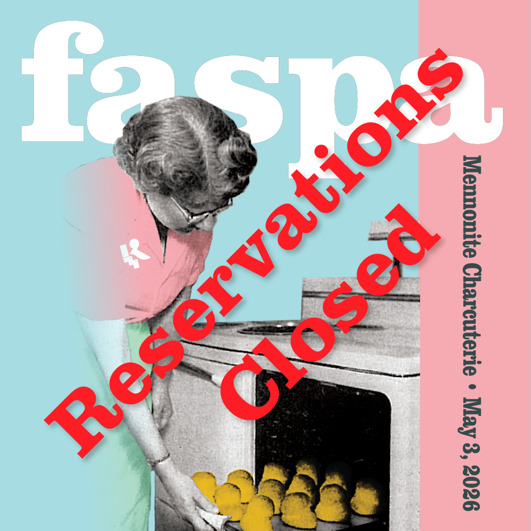 Faspa may be picked up at Kauffman Museum between 4:30 and 6 p.m. on Sunday, May 3.